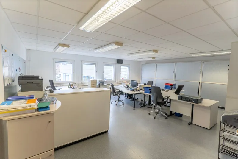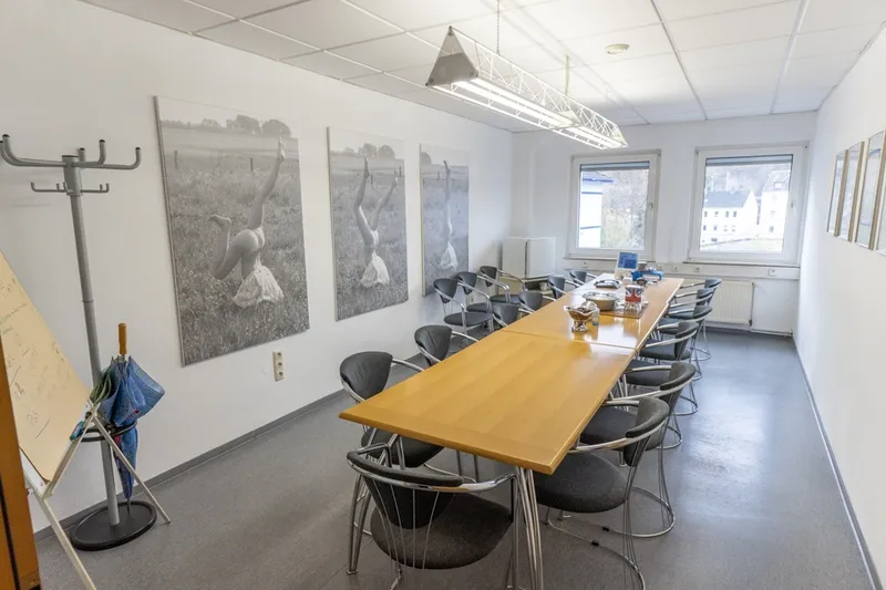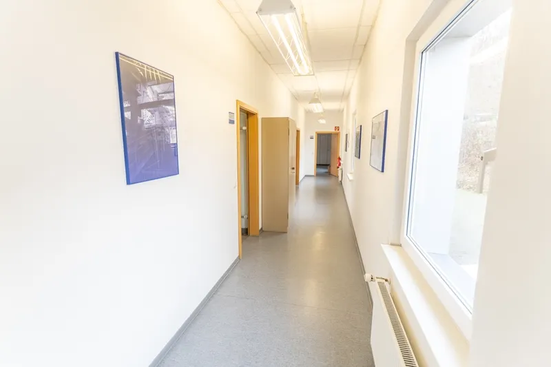 Haupteingang mit PKW- StellplätzeRückansicht mit zweitem ZugangDer HaupteingangZentraler Flur (untere Etage)Besprechungsraum (untere Etage)Büro 1 (untere Etage)Büro 2 (untere Etage)Großraumbüro I (untere Etage)Gepflegtes TreppenhausZentraler Flur (obere Etage)Großraumbüro II (obere Etage)Grundriss obere EtageGrundriss untere EtageBüro 4 (obere Etage)Büro 5 (obere Etage)Vorraum mit EinbaukücheGetrennte WC- AnlagenBiszu 25 PKW- StellplätzeStraßenkarte makro (immomaps.shop)Straßenkarte mikro (immomaps.shop)