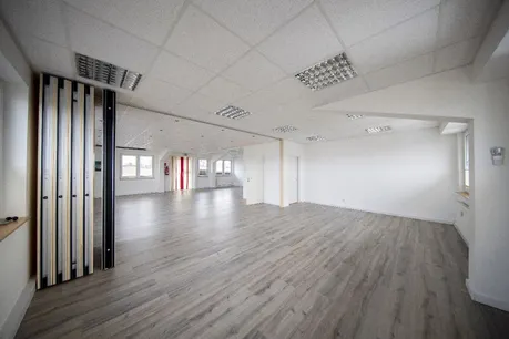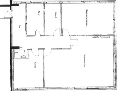 Die Fläche teilt sich auf in ein Großraumbüro das durch eine variable Trennwand noch ein zusätzliches Büro oder ein Besprechungsraum schaffen kann. Außerdem befindet sich auf der ca. 150 m² großen Fläche ein Pausenraum mit Küche, ein WC, ein Flur und 2 weitere Büros.